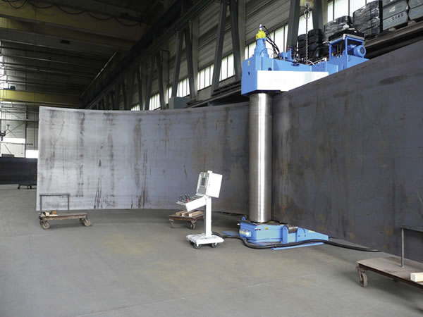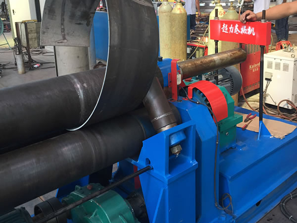 The 3-roll mechanical symmetrical plate bending machine has 3 symmetrically-arranged rolls and the upper roller is located at center of two lower rolls. A worm and gear drive and a screw rod and screw auxiliary drive are used to drive the upper roll to move vertically. The gear mounted on main speed reducer is utilized to mesh the gears of the 2 lower rollers for rotary motion so as to provide torque for the plates. A permanent plastic deformation will be realized upon the metal plates placed between the 3 rollers after a series of continuous bending operations, so the plates will then be formed into cylinders, cones, arcs, or any other shapes we want. While this kind of 3-roll bending machine also has some inadequacies: it is difficult to conduct pre-bending operation upon the plate ends.